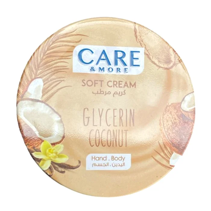 كريم تنعيم الجلسرين من كير آند مور. حافظي على تغذية بشرتكِ وصحتها مع كريم تنعيم الجلسرين. مُعزز بالجلسرين ليمنح بشرتكِ ترطيبًا مكثفًا. يتغلغل الكريم في بشرتكِ ليمنحها صحة وترطيبًا أفضل. ترطيب عميق: هذا الكريم المُنعم غني بجوز الهند ليمنح بشرتكِ نعومةً ولمعانًا. يوفر ترطيبًا ويحبس الرطوبة للحفاظ على نعومة البشرة وصحتها.