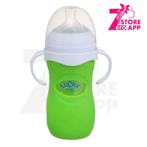 ببرونة لاكي بيبي من الزجاج الحراري. غلاف لحماية الببرونة من الكسر. تحتفظ بالحرارة. الحلمة من السيليكون المرن. تقليل الغازات ووقاية من المغص. يدين إضافيين لسهولة الحمل.