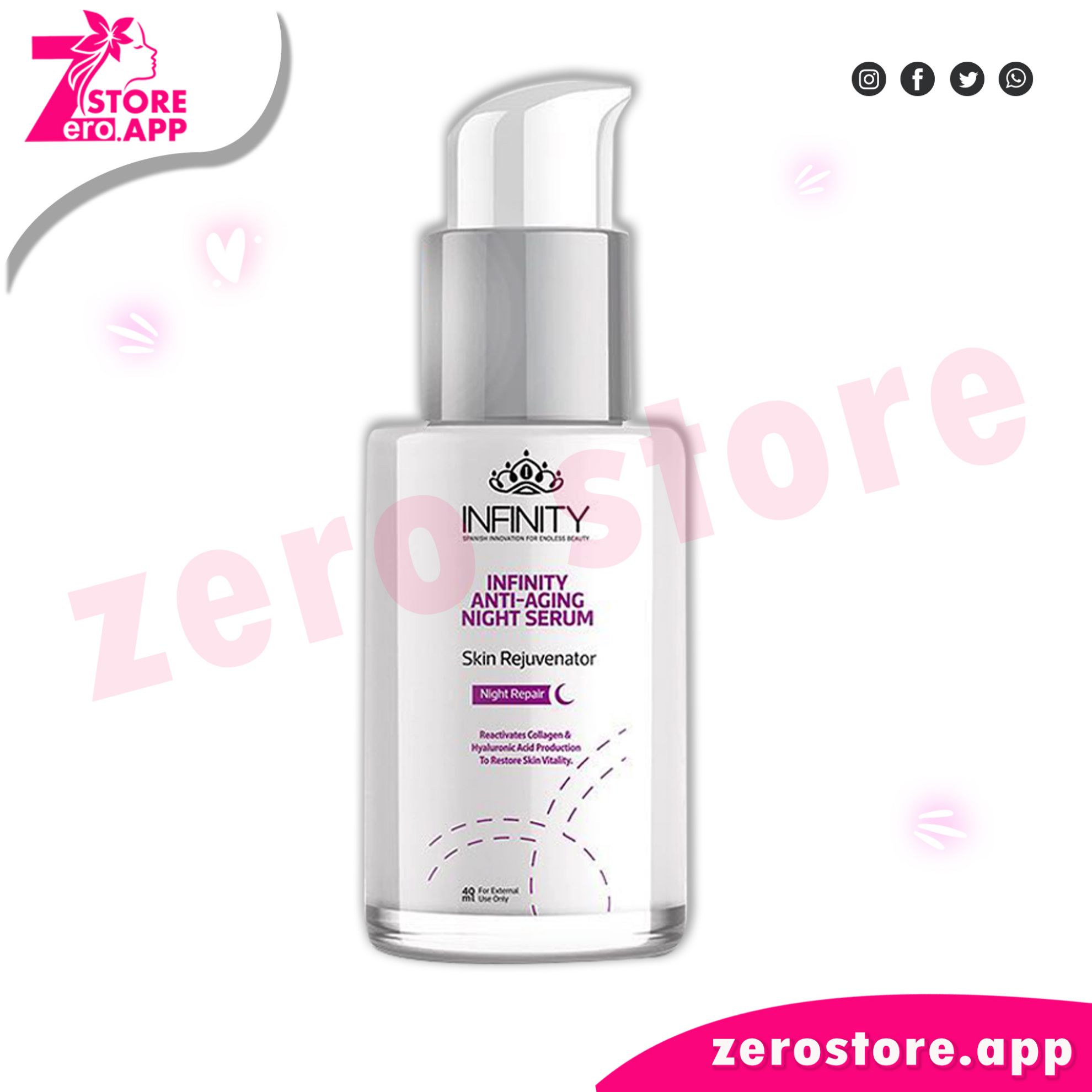 إنفينيتي سيرم ليلي للتجاعيد هو منتج مصمم للعناية بالبشرة وتحسين مظهرها وملمسها خلال الليل. يحتوي على مزيج من المكونات الطبيعية مثل الريتينول وفيتامين C والكولاجين والهيالورونيك أسيد، وهو مصمم لتقليل ظهور التجاعيد وتحسين مرونة البشرة وترطيبها وإشراقتها.