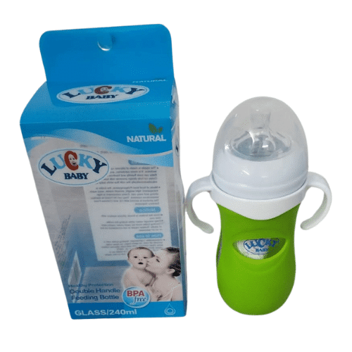 ببرونة لاكي بيبي من الزجاج الحراري. غلاف لحماية الببرونة من الكسر. تحتفظ بالحرارة. الحلمة من السيليكون المرن. تقليل الغازات ووقاية من المغص. يدين إضافيين لسهولة الحمل.