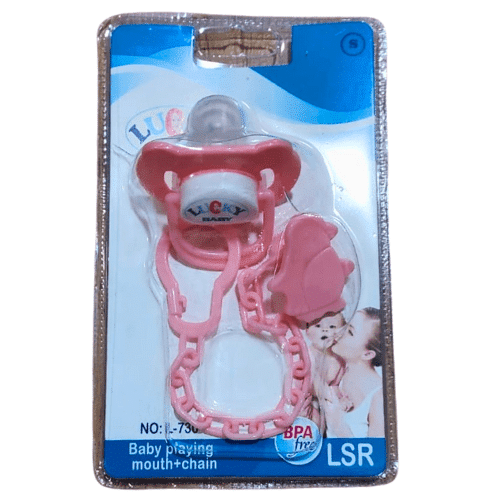 مزودة بسلسلة للتعليق بملابس الطفل وتحافظ على السكاتة من الضياع أو الاتساخ بسبب السقوط.