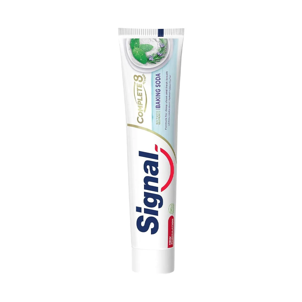 معجون أسنان سيجنال كومبليت 8 عناصر طبيعية بنكهة صودا الخبز وإكليل الجبل يُعزز صحة فمك، لتنظيف عميق ونفس منعش يدوم 12 ساعة. يحتوي على معادن الزنك، وهو مضاد للبكتيريا من مصادر طبيعية، وقد ثبت سريريًا فعاليته في مكافحة مشاكل اللثة، مما يمنحك ابتسامة أكثر صحة. تركيبته مصنوعة من 96% من مكونات طبيعية، ومُعززة بصودا الخبز النقية، ومستخلص إكليل الجبل الطبيعي، ومستخلص النعناع الطبيعي.